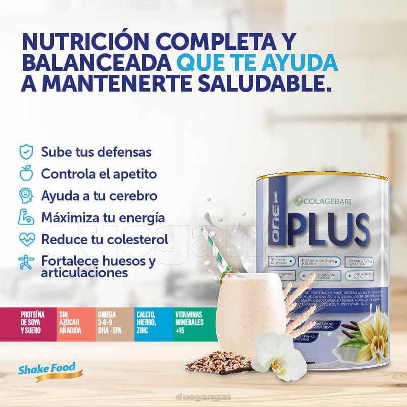 Descubre la revolución en nutrición con ONE PLUS, el alimento en polvo diseñado para potenciar tu bienestar y vitalidad. Con una combinación única de ingredientes seleccionados, este batido te ofrece una experiencia incomparable.